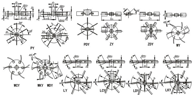 平直叶圆盘涡轮式-PY、平直叶对开圆盘涡轮式-PDY、斜叶圆盘涡轮式-ZY、斜叶对开圆盘涡轮式-ZDY、弯叶圆盘涡轮式-WY、弯叶可拆圆盘涡轮式-WCY、弯叶对开圆盘涡轮式-WDY、弯叶可拆对开圆盘涡轮式-WKY、螺距叶圆盘涡轮-LY、螺距叶可拆圆盘涡轮式-LCY、螺距叶对开圆盘涡轮式-LDY、螺距叶可拆对开圆盘涡轮式-LKY