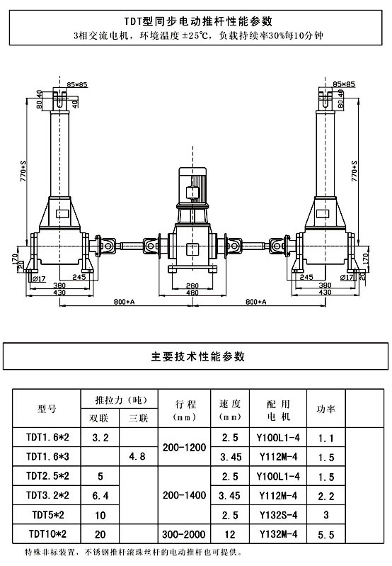 TDT系列同步推杆,是通过减速电机、换向器、连接轴将两台推杆或两台以上推杆同步推拉,绝对同步,可实现远程自动控制,已被广泛被应用于环保设备泌水器上,产品性能稳定,附产品详细参数图。